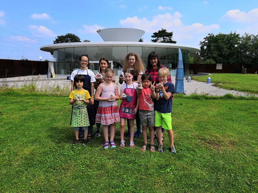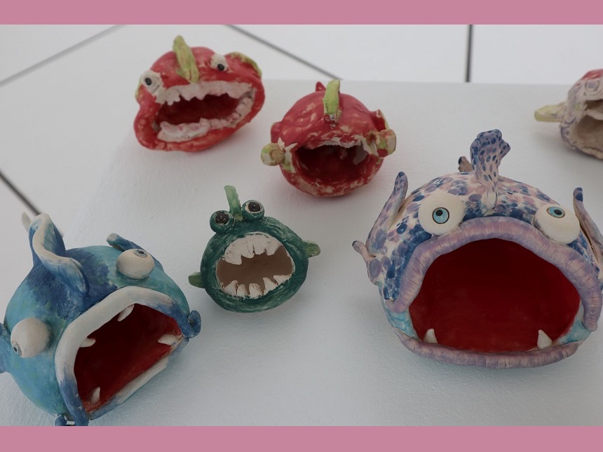 Die Künstlerin und Kunstpädagogin führte nun zum dritten Mal einen Workshop durch, diesmal zusammen mit ihrer Assistentin Katharina Burak, der von ihr auf das KERAMION zugeschnitten und speziell für Kinder konzipiert war. Susanne Hanfs großes Anliegen ist es, junge Menschen für die Vielgestaltigkeit von Lebensformen zu sensibilisieren. Den Blickwinkel der Teilnehmenden erweitert sie durch bildhafte Reisen in die Welt der Fabelwesen aus Mythen und Legenden sowie Bilderbücher, die sich an Kinder richten.
