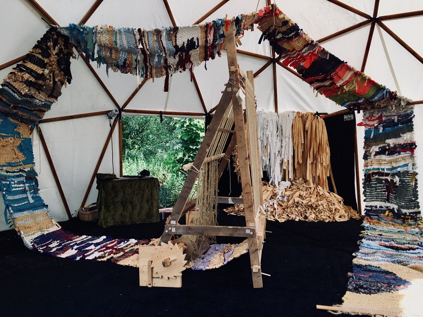 Der extra dafür konzipierte LOOM-LOOP ist ein robuster Web-Rahmen mit vertikaler Arbeitsfläche und war in einem öffentlichen Raum des „ZukunftsDorf22“ aufgestellt, einer selbst-organisierten Plattform experimenteller Zukunftsforschung, das auch Teil des Kassler „Ecosystem“ der documenta15 war. Die Künstlerin und ihr Team (Kollektiv) bespielte mit dem LOOM-LOOP einen „geodätischen Kuppelbau“, eine Raum-Struktur, die vor Ort aufgebaut war und die durch ihre halb kugelrunde Form eine besondere Aufenthaltsatmosphäre schuf. Dieser runde Raum wurde vom LOOM-LOOP zum Ort der Begegnung und des aktiven Tuns. Material, das die Künstlerin ausgewählt und mitgebracht hatte, wurde kontextualisiert und eingewebt. Ein großer Teil des Materials stammte aus einer ehemaligen Textilfabrik aus Bosnien und Herzegowina mit dem heutigen Ortsnamen „Atlantis KV“. Ein anderer Teil waren Funde und Mitbringsel aus temporär bewohnten Orten von Menschen auf der Flucht an der EU-Außengrenze in Bosnien und Herzegowina. Die Wertigkeit und Geschichte der Materialien wurde hier recycelt und transformiert, in neue Abfolgen angeordnet und miteinander und gemeinsam verwebt. Das Material bot hier einerseits einen Wissenserwerb, Wissensaustausch und reihte sich dann durch die webenden Hände in die neu gestaltete Fläche des wachsenden Textils ein. Der Schwerpunkt war die Beteiligung der Menschen, die zahlreichen und diversen Gäste der documenta Kunstausstellung. Der wachsende Stoff wuchs also Meter um Meter aus dem Rahmen heraus und schmückte zunehmend die Raumdecke, wanderte bis an die andere Seite des Raumes, wodurch die Entstehungsgeschichte stets und im Wandel miterlebt werden konnte. Das LOOM-LOOP Gewebe wurde die Sichtbarmachung kollektiven Schaffens und der Zusammenhänge und Abhängigkeiten der mitwirkenden Fäden/Hände im gesamten Gewebe.