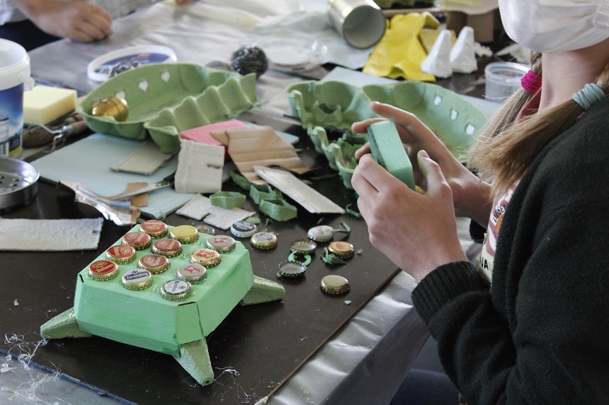 Die Verwendung von ungewöhnlichen Materialien stellte die Kinder vor eine kreative Aufgabe. Was kann alles aus einem Kronkorken oder einem Bonbonpapier gestaltet werden?