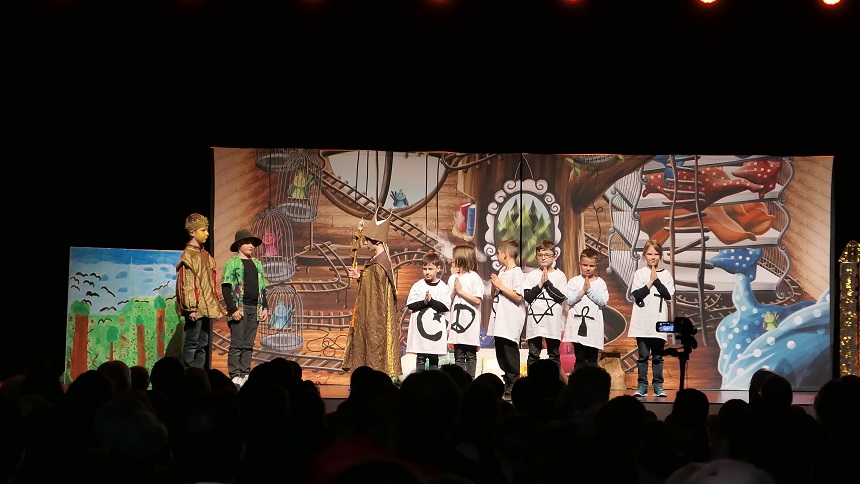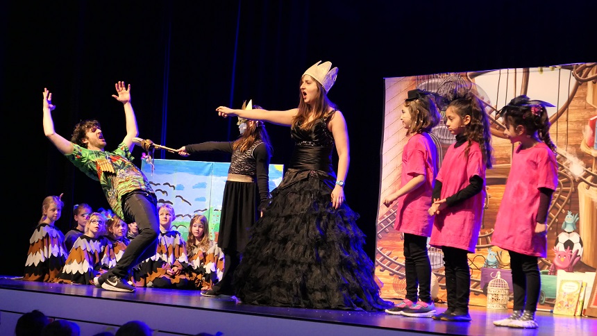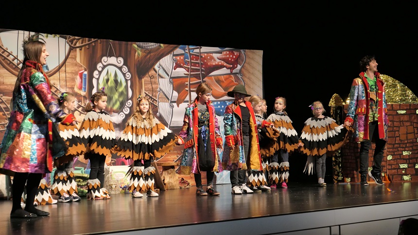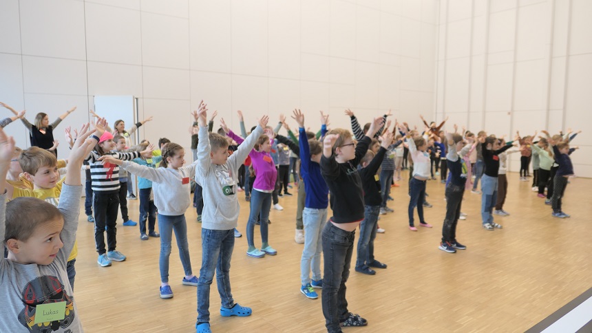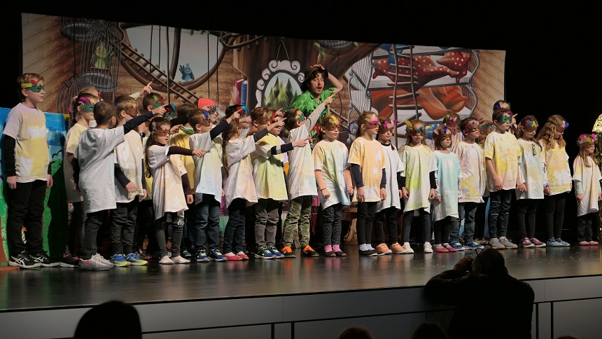 Und dann war es soweit: am fünften Tag der Projektwoche standen zwei Aufführungen der Kinderoper auf dem Plan. Vor jeweils „vollem Haus“ mit über 350 Plätzen spielten, sangen und tanzten die Kinder gemeinsam mit den zwei Profisängern der TourneeOper Mannheim die Geschichte von Papageno und seiner Zauberflöte.